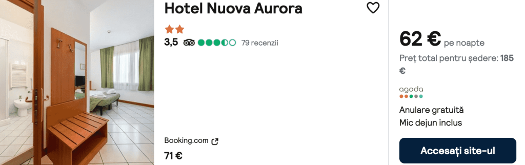 CAZARE 1 (+ mic dejun): Hotel Nuova Aurora, Preț cameră dublă 185€, Preț persoană 93€, 13-16 Oct 2024 (3 nopți)