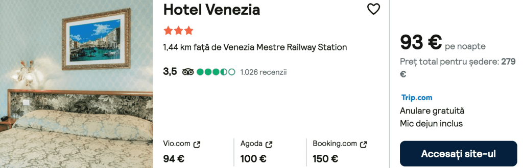 CAZARE 3 (+ mic dejun): Hotel Venezia, Preț cameră dublă 279€, Preț persoană 140€, 13-16 Oct 2024 (3 nopți)