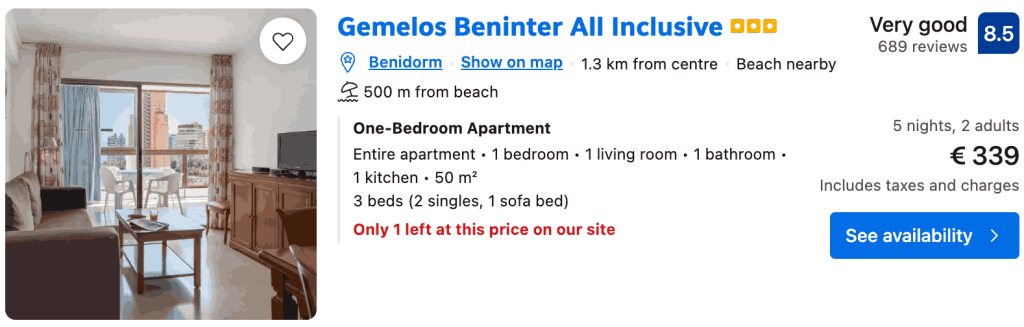 CAZARE 3: Gemelos Beninter, Preț cameră dublă 339€, Preț persoană 170€, 10-15 Mai 2026 (5 nopți)