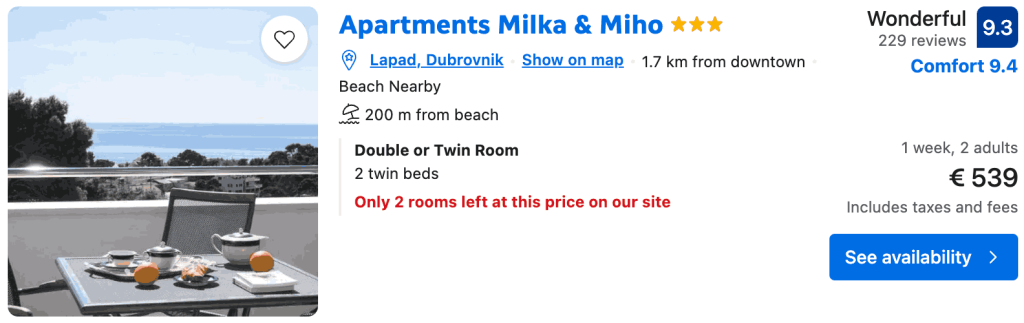 CAZARE 3: Apartements Milka & Miho, Preț cameră dublă 539€, Preț persoană 270€, 2-9 Iun 2026 (7 nopți)