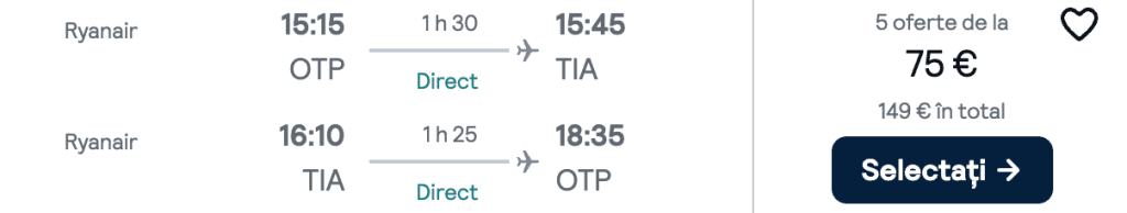 ZBOR: București -> Tirana, Preț dus-întors 75€/pers, 16-23 Mai 2025