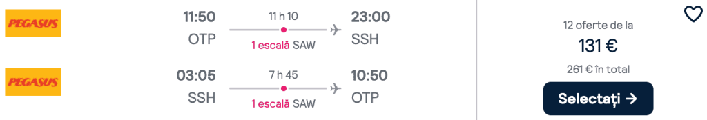 ZBOR: București -> Sharm El-Sheikh, Preț dus-întors 131€/pers, 26 Nov-3 Dec 2025