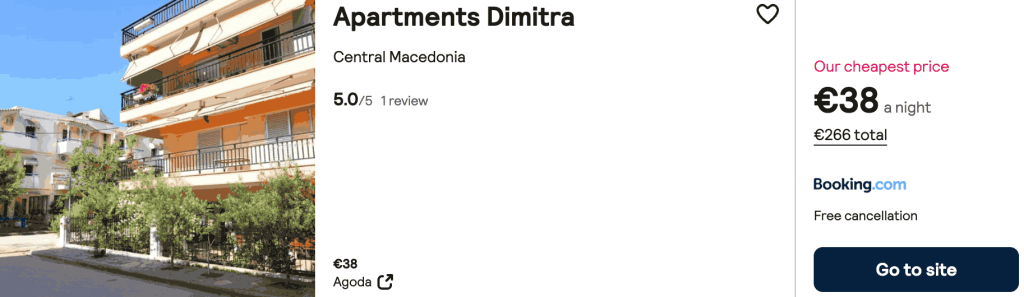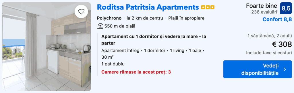 CAZARE 1: Apartments Dimitra, Preț cameră dublă 266€, Preț persoană 133€, 20-27 Mai 2026 (7 nopți)