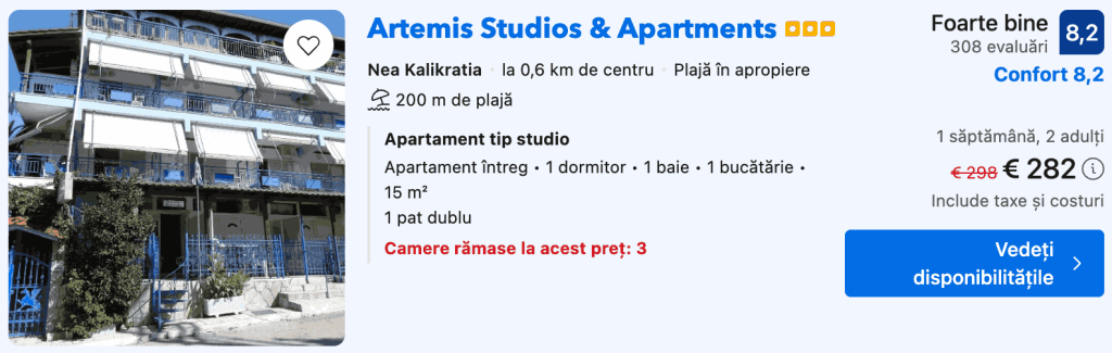 CAZARE 2: Artemis Studios, Preț cameră dublă 282€, Preț persoană 141€, 20-27 Mai 2026 (7 nopți)