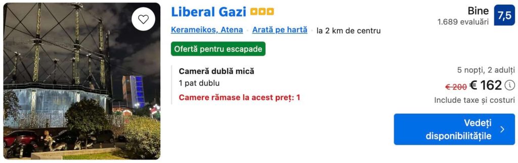 CAZARE 1: Liberal Gazi, Preț cameră dublă 162€, Preț persoană 81€, 4-9 Iul 2026 (5 nopți)