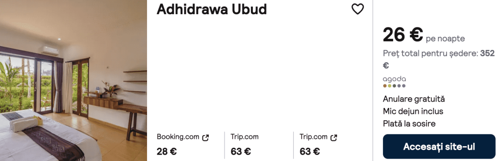 CAZARE 3 (+ mic dejun): Adhidrawa Ubud, Preț cameră dublă 352€, Preț persoană 176€, 22 Ian-5 Feb 2025 (14 nopți)