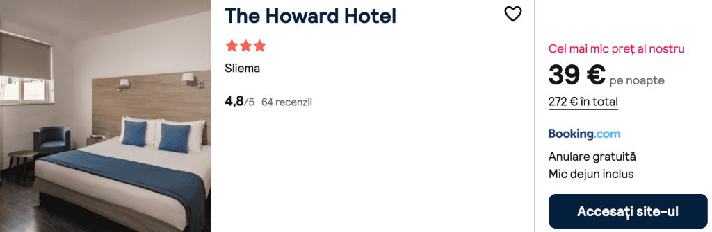 CAZARE 3 (+ mic dejun): The Howard Hotel, Preț cameră dublă 272€, Preț persoană 136€, 17-24 Ian 2026 (7 nopți)