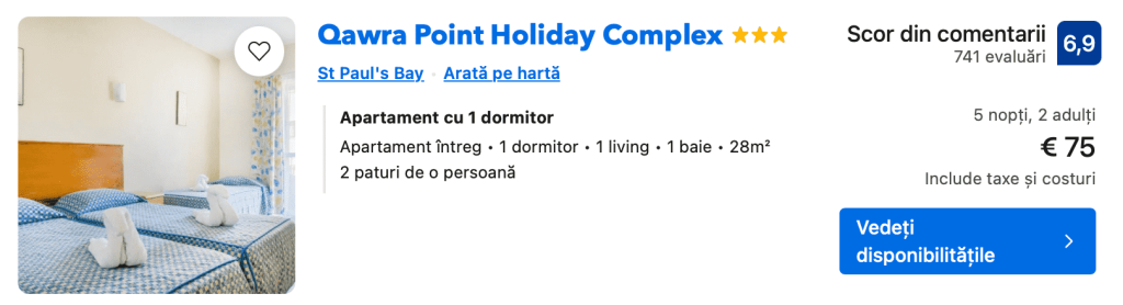 Vă prezentăm cea mai ieftină vacanță în Malta de 5 zile disponibilă în Ianuarie 2024. Biletul de avion este 32€/pers. Pentru fiecare perioadă sunt disponibile 3 variante de cazare cea mai ieftină fiind doar 38€/pers.