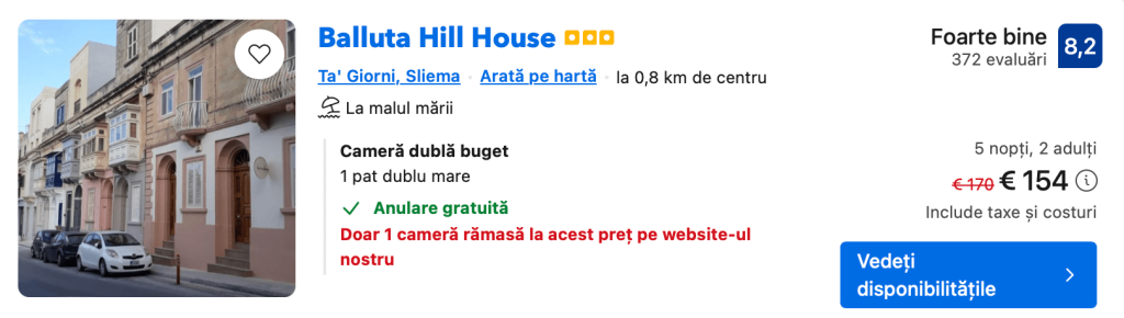 CAZARE 3: Balluta Hill, Preț cameră dublă 154€, Preț persoană 77€, 8 – 13 Ian 2024 (5 nopți)