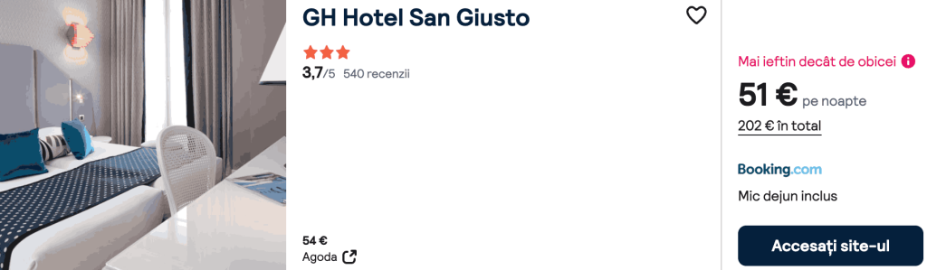 CAZARE 1 (+ mic dejun): GH Hotel San Giusto, Preț cameră dublă 202€, Preț persoană 101€, 1-5 Feb 2026 (4 nopți)