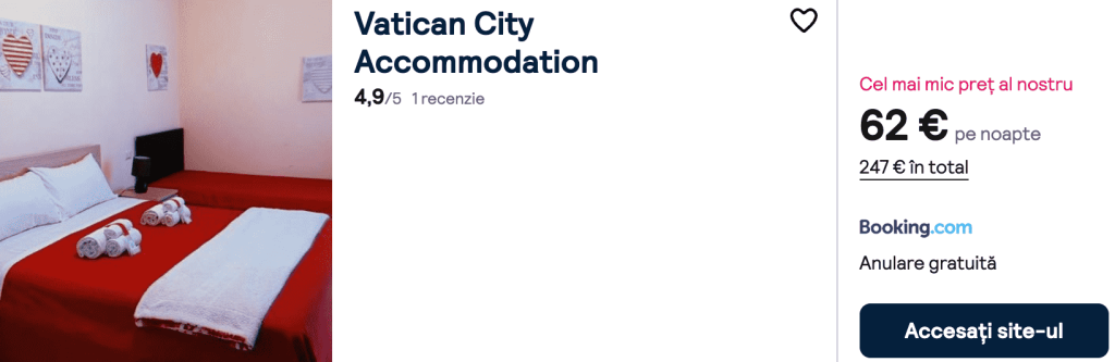 CAZARE 1: Vatican City Accomodation, Preț cameră dublă 247€, Preț persoană 123€, 1-5 Feb 2026 (4 nopți)