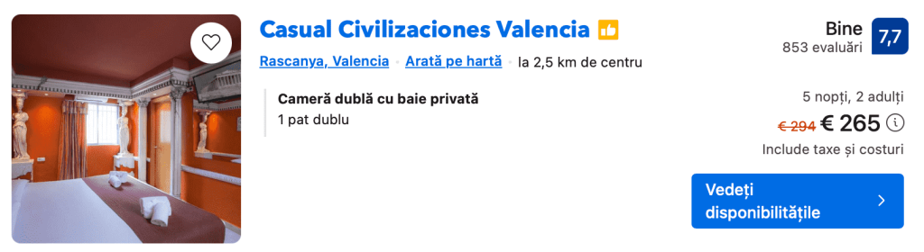 CAZARE 3: Casual Civilizaciones Valencia, Preț cameră dublă 265€, Preț persoană 133, 1-6 Feb 2024 (5 nopți)