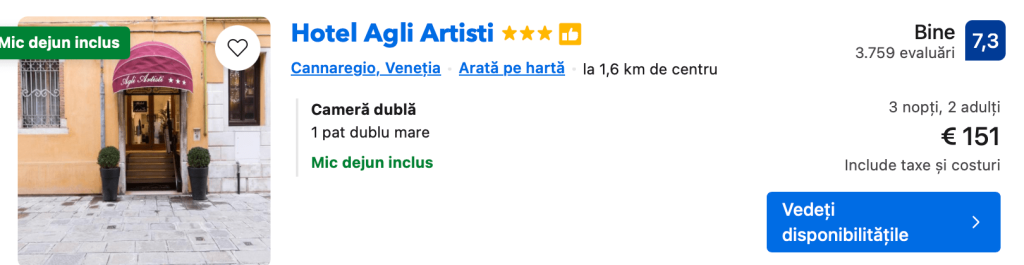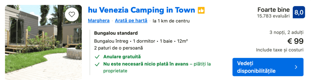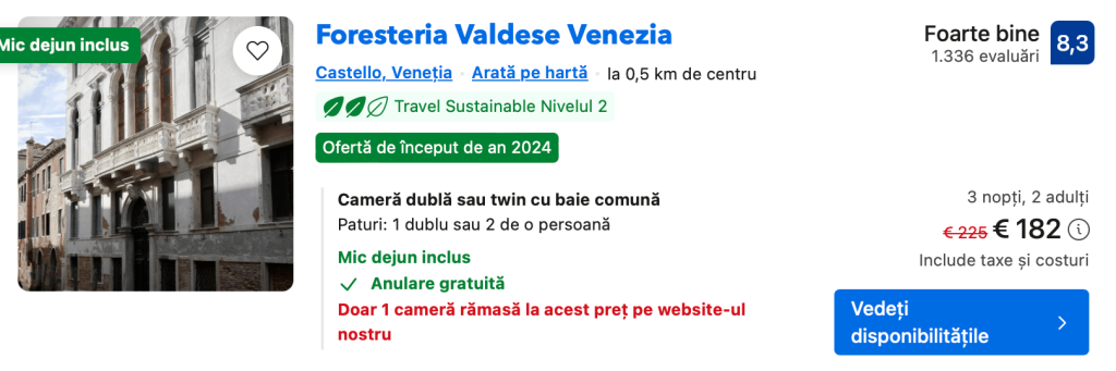 Vă prezentăm cea mai ieftină vacanță în Veneția de 3 zile disponibilă în Ianuarie. Biletul de avion este 26€/pers dar dacă cumpărați biletele direct de pe Wizz Air și activați WIZZ Discount Club prețul este doar de 20€/pers. Pentru fiecare perioadă sunt disponibile 3 variante de cazare cea mai ieftină fiind doar 50€/pers și dacă aveți Booking Genius beneficiați de o reducere suplimentară la unele cazări.
