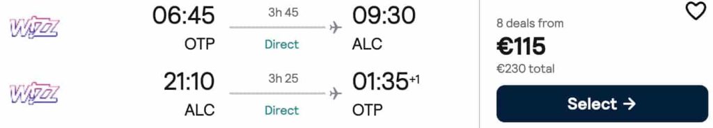 ZBOR: București -> Alicante, Preț dus-întors 115€/pers, 17-22 Oct 2026