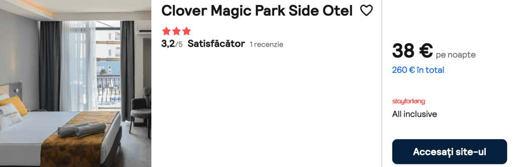 CAZARE 1 (ALL INCLUSIVE): Clover Magic Park Side, Preț cameră dublă 260€, Preț persoană 130€, 16-23 Oct 2025 (7 nopți)