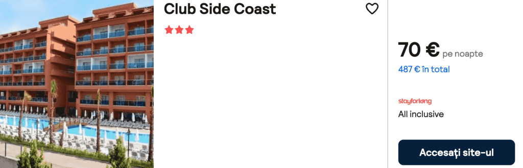 CAZARE 3 (ALL INCLUSIVE): Club Side Coast, Preț cameră dublă 487€, Preț persoană 244€, 16-23 Oct 2025 (7 nopți)
