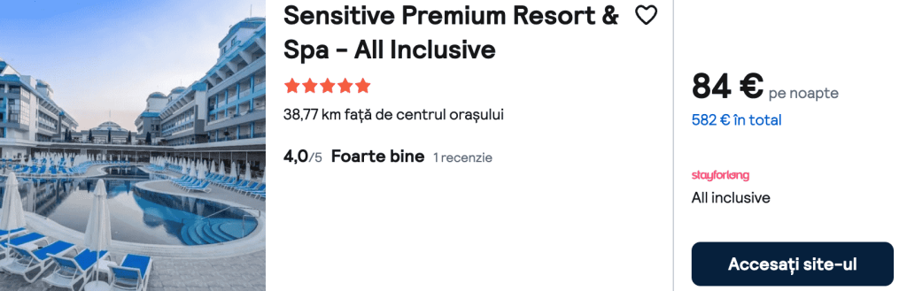 CAZARE 4 (ALL INCLUSIVE): Sensitive Premium Resort&Spa, Preț cameră dublă 582€, Preț persoană 291€, 16-23 Oct 2025 (7 nopți)
