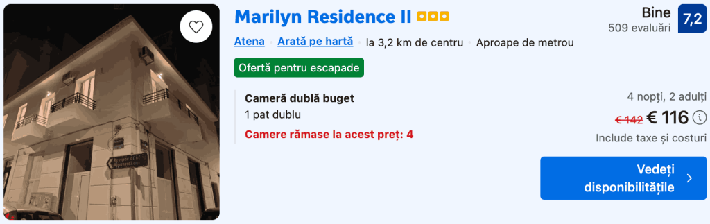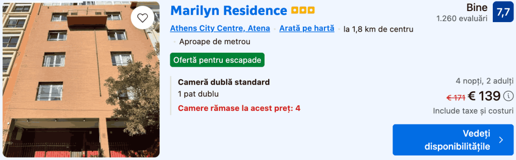 CAZARE 2: Marilyn Residence, Preț cameră dublă 139€, Preț persoană 70€, 7-11 Iun 2026 (4 nopți)