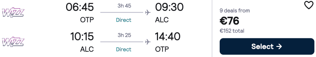 ZBOR: București -> Alicante, Preț dus-întors 76€/pers, 25 Apr-2 Mai 2026