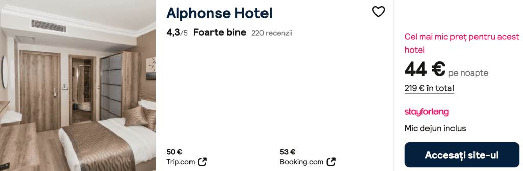 CAZARE 3 (+ mic dejun): Alphonse Hotel, Preț cameră dublă 219€, Preț persoană 110€, 20-25 Sep 2025 (5 nopți)