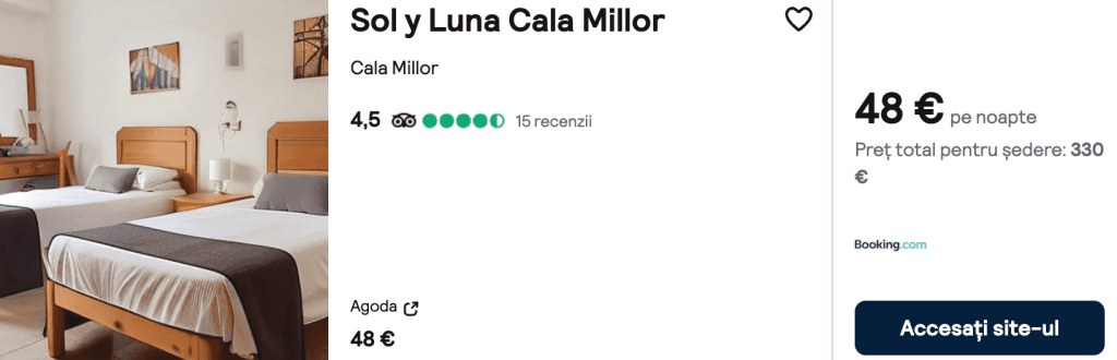 CAZARE 1: Sol y Luna Cala Millor, Preț cameră dublă 330€, Preț persoană 165€, 14-21 Oct 2024 (7 nopți)