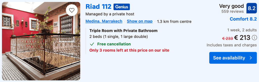 CAZARE 1: Riad 112, Preț cameră dublă 213€, Preț persoană 107€, 12-19 Dec 2025 (7 nopți)
