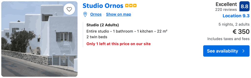CAZARE 2: Studio Ornos, Preț cameră dublă 350€, Preț persoană 175€, 7-12 Iun 2026 (5 nopți)
