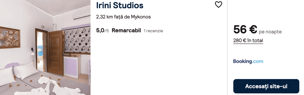 CAZARE 1: Irini Studios, Preț cameră dublă 280€, Preț persoană 140€, 21-26 Sep 2025 (5 nopți)