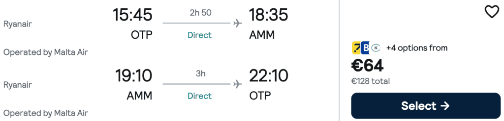 ZBOR: București -> Amman, Preț dus-întors 64€/pers, 1-8 Iun 2026
