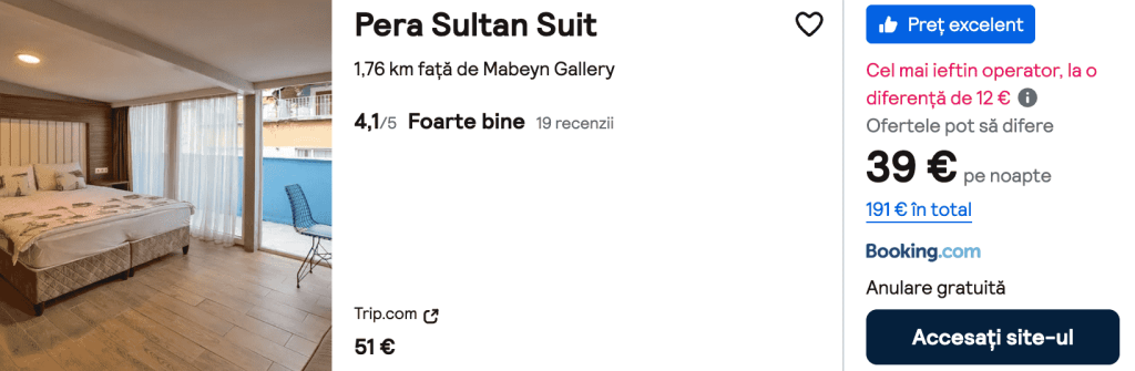 CAZARE 3: Pera Sultan Suit, Preț cameră dublă 191€, Preț persoană 96€, 22-27 Iun 2025 (7 nopți)