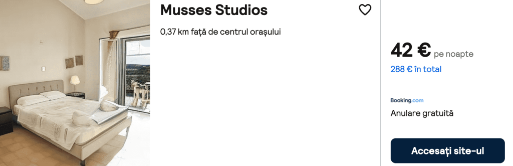 CAZARE 1: Musses Studios, Preț cameră dublă 288€, Preț persoană 144€, 15-22 Sep 2025 (7 nopți)