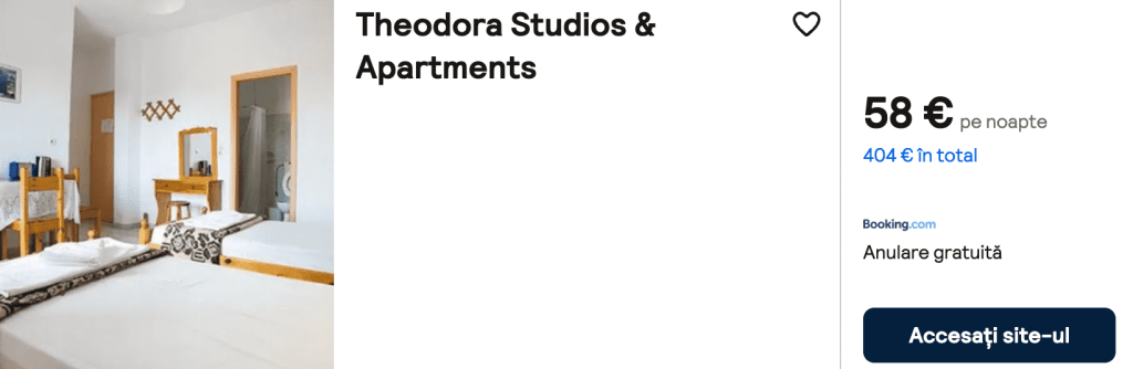 CAZARE 4: Theodora Apartments, Preț cameră dublă 404€, Preț persoană 202€, 15-22 Sep 2025 (7 nopți)