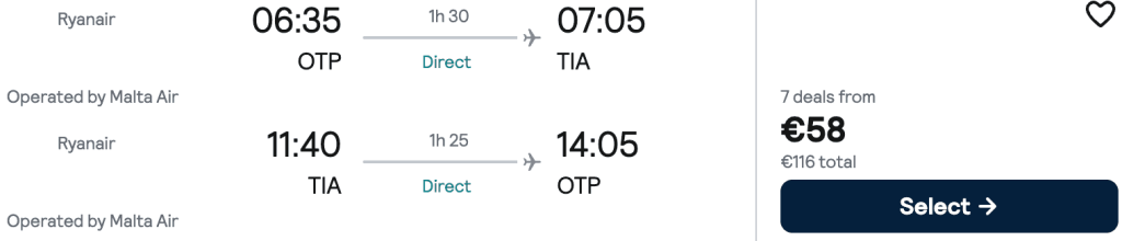ZBOR: București -> Tirana, Preț dus-întors 58€/pers, 23-27 Mai 2026