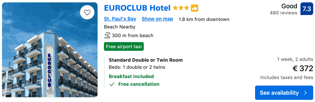 CAZARE 1 (+ mic dejun): Euroclub Hotel, Preț cameră dublă 372€, Preț persoană 186€, 18-25 Apr 2026 (7 nopți)