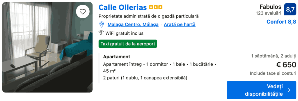 CAZARE 3 (MALAGA): Calle Ollerias, Preț cameră dublă 650€, Preț persoană 325€, 20-27 Mai 2026 (7 nopți)