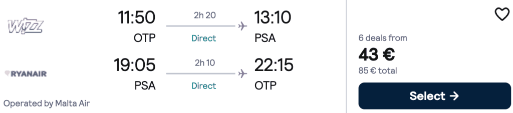 ZBOR: București -> Pisa, Preț dus-întors 43€/pers, 14-17 Iun 2026