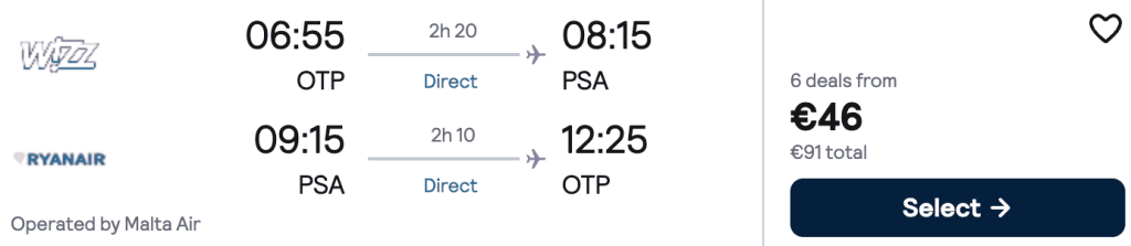 ZBOR: București -> Pisa, Preț dus-întors 46€/pers, 5-9 Mai 2026