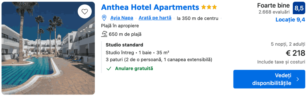 CAZARE 2 (AYIA NAPA): Anthea Hotel Apartments, Preț cameră dublă 218€, Preț persoană 109€, 16-21 Apr 2026 (5 nopți)