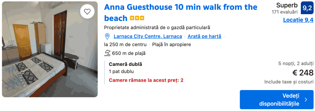 CAZARE 3 (LARNACA): Anna Guesthouse, Preț cameră dublă 248€, Preț persoană 124€, 16-21 Apr 2026 (5 nopți)
