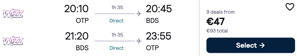 ZBOR: București -> Brindisi, Preț dus-întors 47€/pers, 8-12 Iun 2026