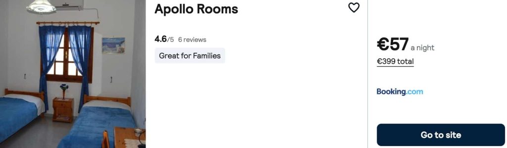 CAZARE 1: Apollo Rooms, Preț cameră dublă 399€, Preț persoană 199€, 9-16 Iul 2026 (7 nopți)