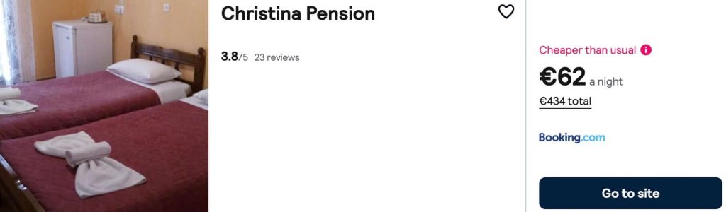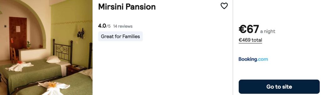 CAZARE 3: Mirsini Pansion, Preț cameră dublă 469€, Preț persoană 235€, 9-16 Iul 2026 (7 nopți)