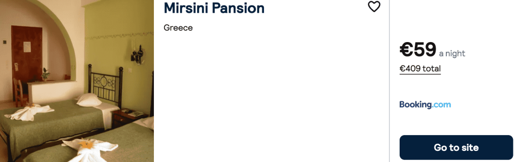 CAZARE 2: Mirsini Pansion, Preț cameră dublă 409€, Preț persoană 205€, 1-8 Sep 2025 (7 nopți)