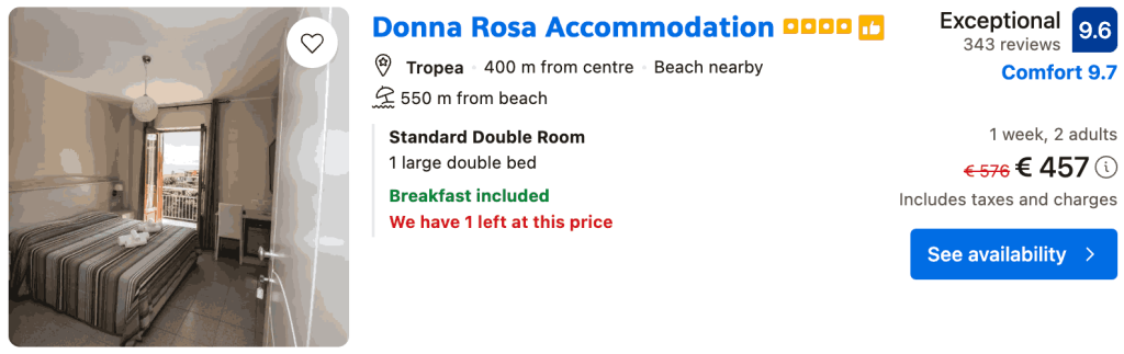 Prinde vreme bună cu prețuri mici la început de sezon! Hai în TROPEA cu doar 189€ pentru zbor dus-întors și cazare 7 nopți cu mic dejun.