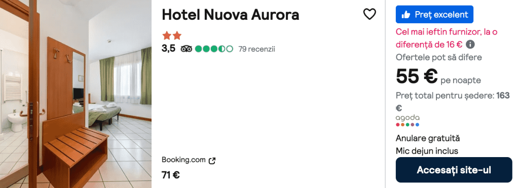 CAZARE 1 (+ mic dejun): Hotel Nuova Aurora, Preț cameră dublă 163€, Preț persoană 82€, 22-25 Oct 2024 (3 nopți)