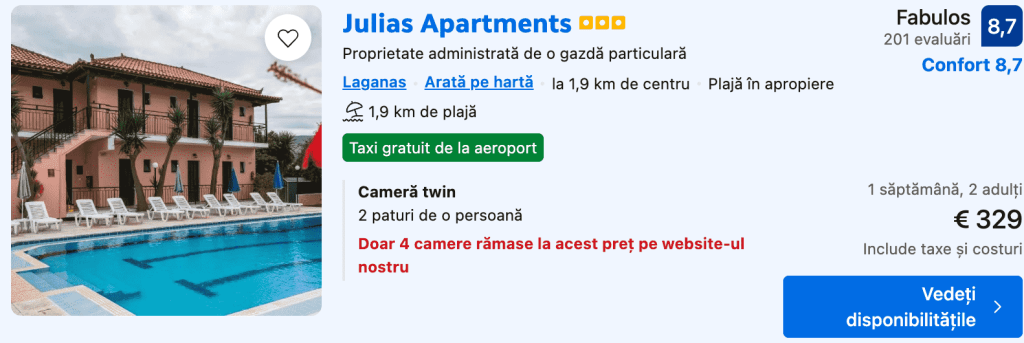 CAZARE 3: Julias Apartments, Preț cameră dublă 329€, Preț persoană 165€, 19-26 Iun 2025 (7 nopți)