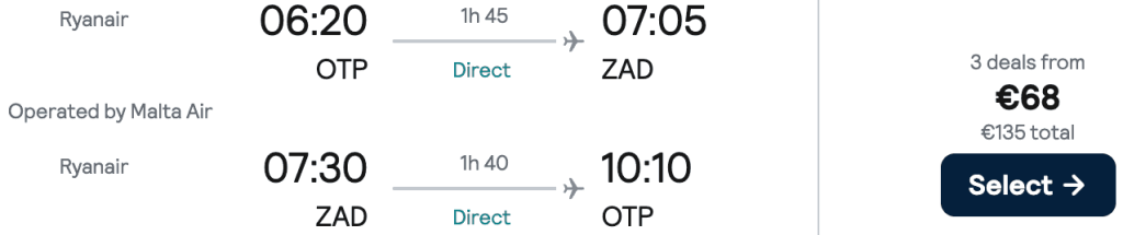 ZBOR: București -> Zadar, Preț dus-întors 68€/pers, 11-18 Iun 2026