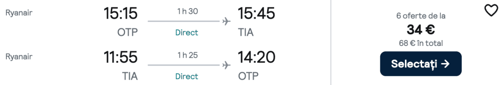 ZBOR: București -> Tirana, Preț dus-întors 34€/pers, 17-20 Oct 2025