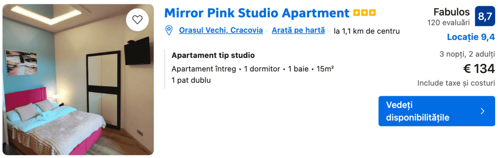 CAZARE 2: Mirror Pink Apart, Preț cameră dublă 134€, Preț persoană 67€, 14-17 Iun 2025 (3 nopți)
