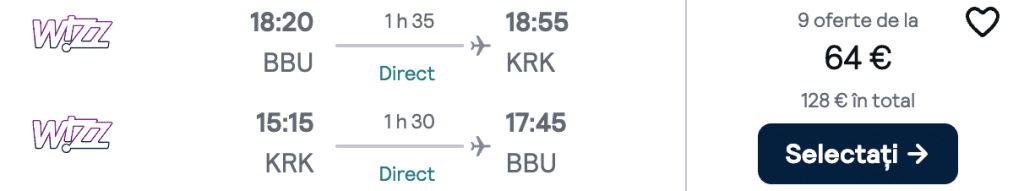 ZBOR: București Băneasa -> Cracovia, Preț dus-întors 64€/pers, 14-17 Iun 2025
